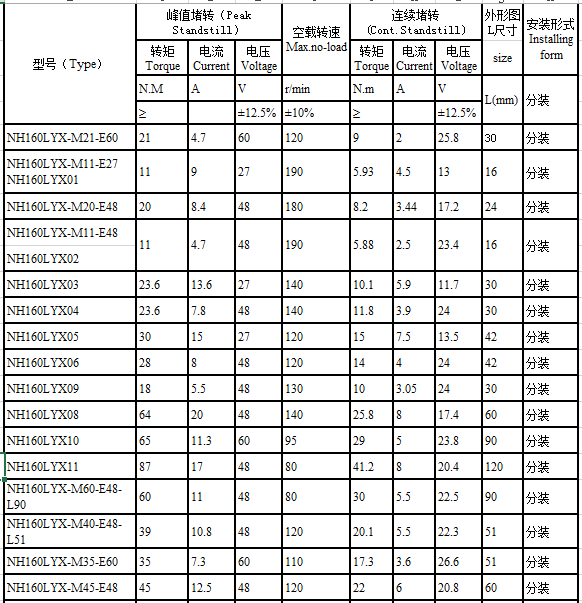 NH160LYX series brushless torque motor performance indicators
